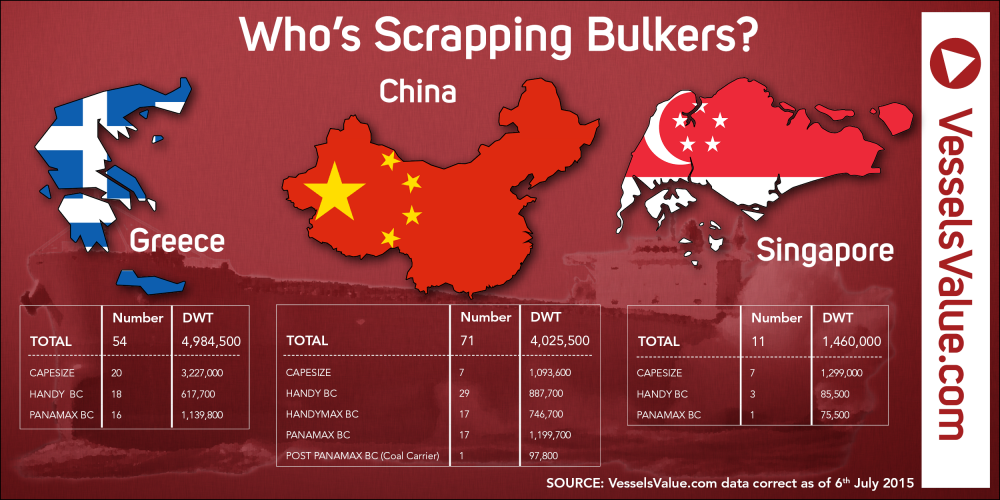 Greek owners have scrapped proportionally more Capesize and Handysize bulkers than Chinese owners in 2015 YTD. Due in part to a more pessimistic view on the drybulk market, preferring to scrap and exit the sector rather than reinvest in DD works and sit it out.